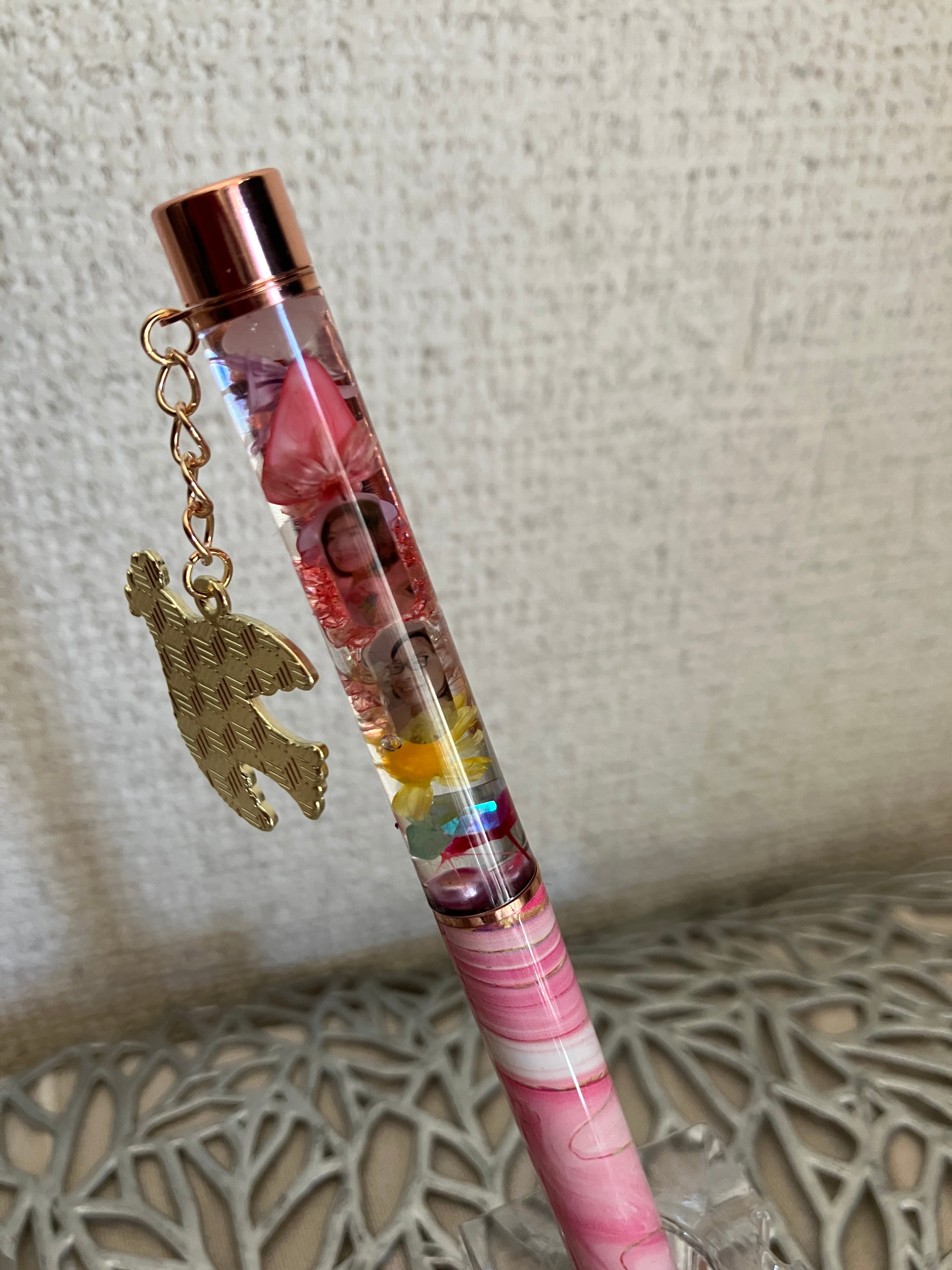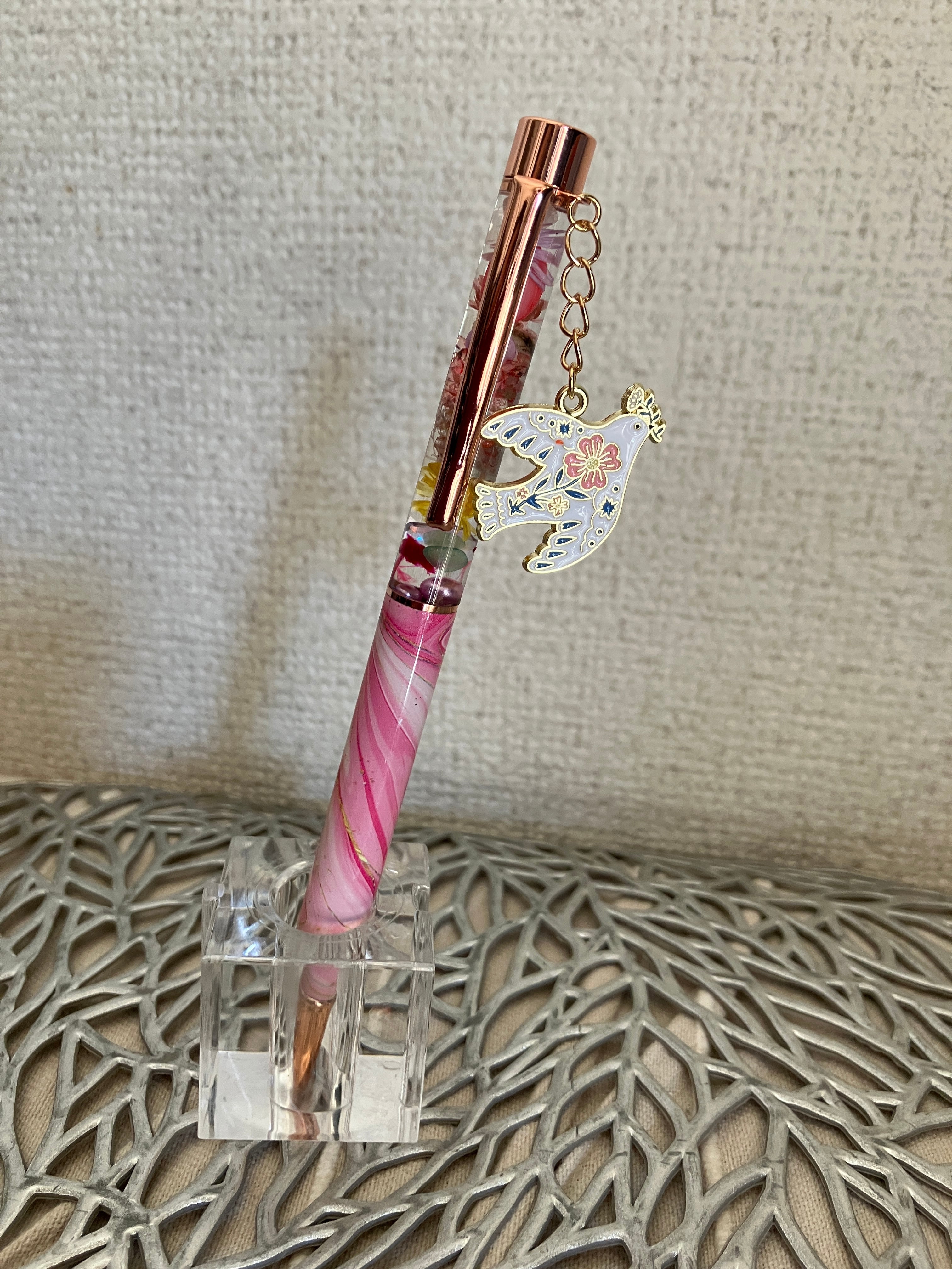 12さわなおさんモデル 春花束 ボディ:ピンクマーブル チャーム:ハトピンク Uracy Springボールペン